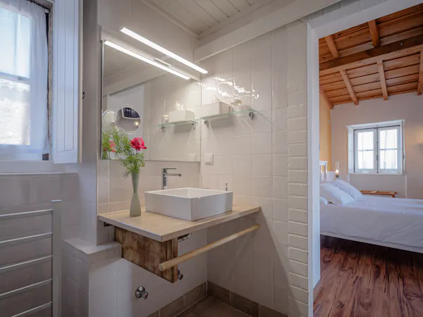 Distribuída por dois pisos, a casa foi pensada para que nada falte: no piso térreo encontra uma suite com casa de banho privativa e uma ampla área de estar em open space com salamandra, perfeita para as noites mais frias. A cozinha, totalmente equipada com frigorífico, fogão de indução, forno, micro-ondas, máquina de café, lava-loiça, máquina de lavar e secar roupa, chaleira, torradeira e varinha mágica, tem tudo o que precisa para preparar refeições caseiras em boa companhia. No mezanino, o segundo quarto oferece uma janela de telhado com vista única. Terraço privativo, ar condicionado, Smart TV e Wi-Fi completam a experiência. Toalhas de banho, roupa de cama, toalhas de piscina, secador de cabelo, ferro e tábua de engomar são disponibilizados.